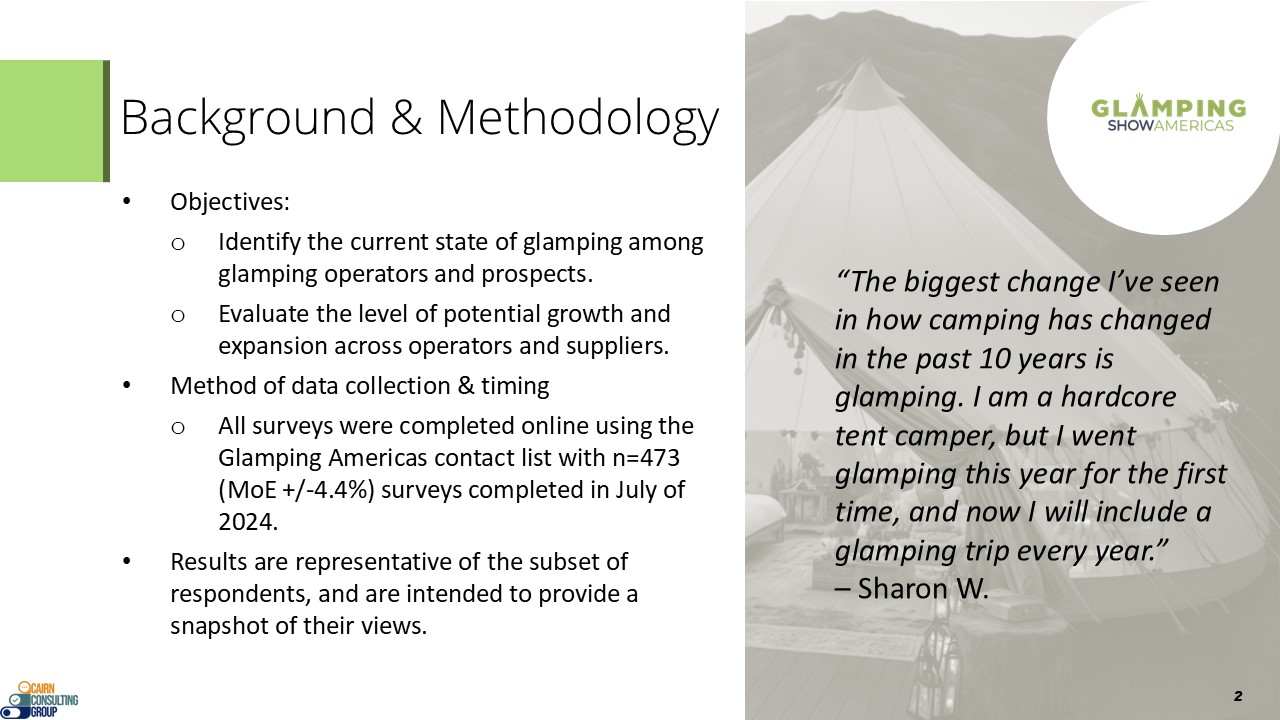 The research was conducted in the late Spring/early Summer, 2024, and queries three segments: current glamping operators, those thinking of entering/just entering the business (as operators) and suppliers/manufactures that sell to glamping operators. The survey was sent to the database for Glamping Business Americas magazine.