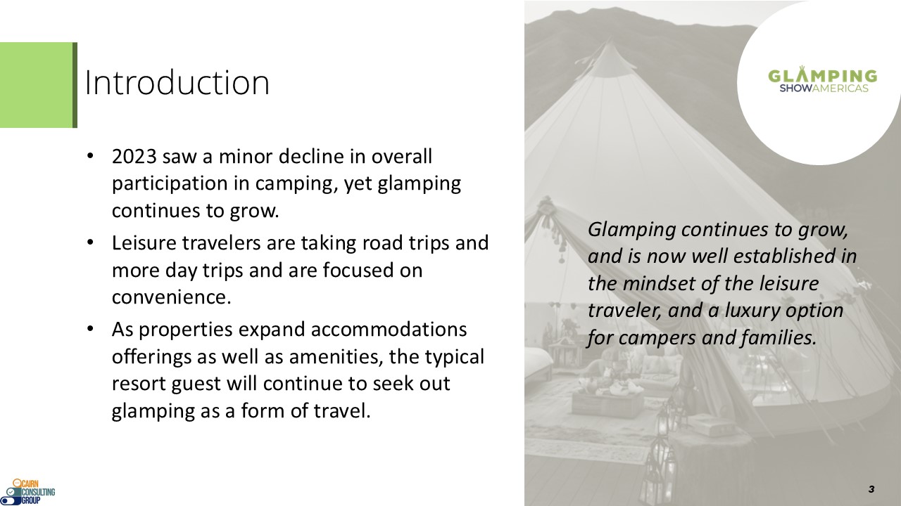 Industry knowledge is particularly important for glamping operators and suppliers to create a business plan, secure financing, or prepare for future growth. As statistics for this newly developing industry are difficult to come by, Glamping Show Americas has partnered with Cairns Consulting to launch our first Annual State of the Industry Report. This report is an effort to begin collecting data that is useful to our customers to help guide their businesses.