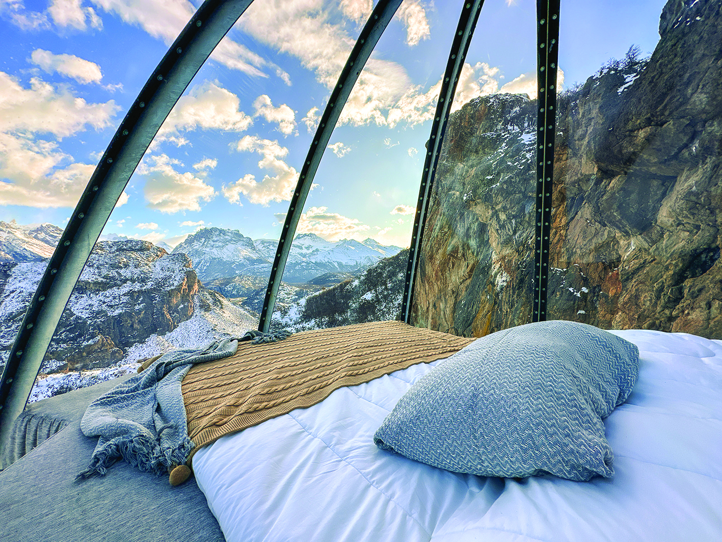 From there, they hike through native lenga forests, taking in breathtaking views of the valleys before reaching the final ascent via a ferrata climb to their capsule. Once inside, they are surrounded by panoramic glass walls that immerse them entirely in the landscape. The transparent back wall and mirrored bathroom create a striking sense of exposure to the rock face, offering a perspective that is both exhilarating and humbling.